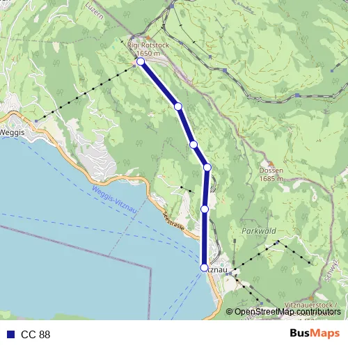 The first stop of the CC 88 rail route is Rigi Kaltbad-First and the last stop is Vitznau. CC 88 is operational during täglich.