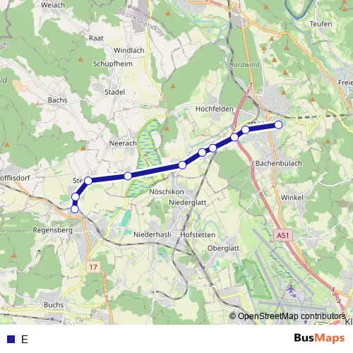 See why over 2 million users trust and consider busmaps.com as the best public transport website. busmaps gives you Dielsdorf Buses suggested routes, real-time bus tracker, line route maps in Dielsdorf, and helps to find the closest E bus stops near you. No internet available? Download an offline PDF map and bus schedule for the E bus to take on your trip.