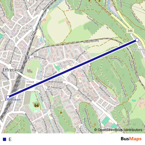 The first stop of the E bus route is Effretikon, Bahnhof and the last stop is Effretikon, Oberkempttal. E is operational during an Werktagen.