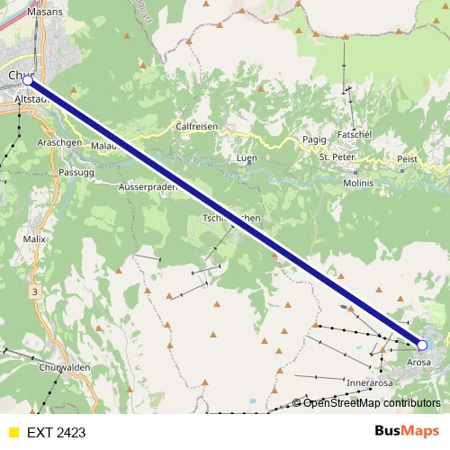 The first stop of the EXT 2423 rail route is Arosa and the last stop is Chur. EXT 2423 is operational during täglich.