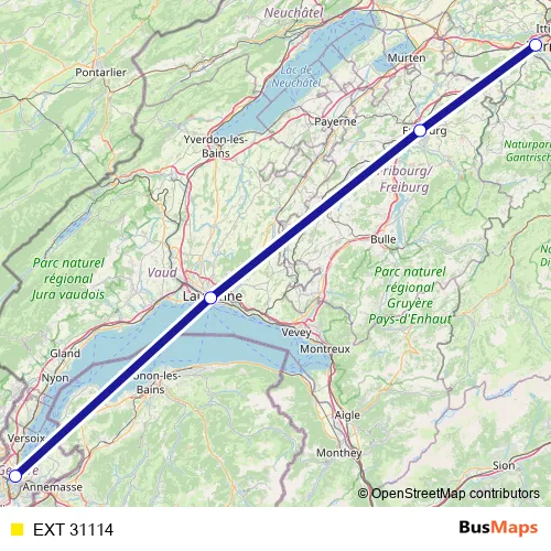 The first stop of the EXT 31114 rail route is Bern and the last stop is Genève. EXT 31114 is operational during täglich.