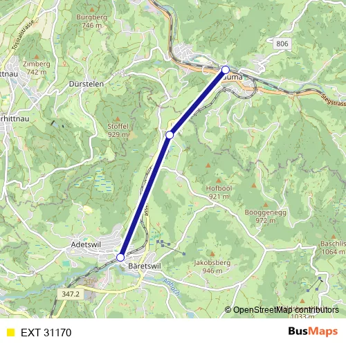 The first stop of the EXT 31170 rail route is Bauma and the last stop is Bäretswil. EXT 31170 is operational during täglich.