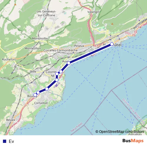 The first stop of the Ev bus route is Boudry Littorail, gare and the last stop is Neuchâtel, Place Pury. Ev is operational during an Werktagen.