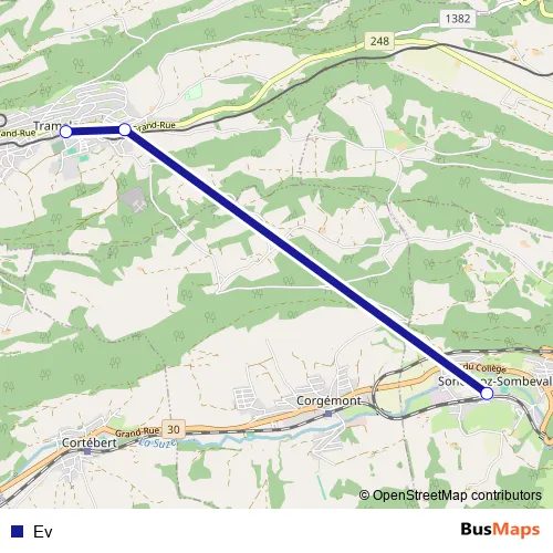 The first stop of the Ev bus route is Tramelan, gare and the last stop is Sonceboz-Sombeval, gare. Ev is operational during am Wochenende.