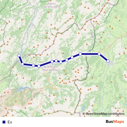 The first stop of the Ev bus route is Gstaad, Bahnhof and the last stop is Montbovon, gare. Ev is operational during an Werktagen.