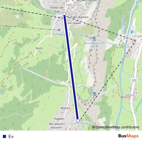 The first stop of the Ev bus route is Mürren, Schilthornbahn and the last stop is Gimmelwald, Schilthornbahn. Ev is operational during an Werktagen.