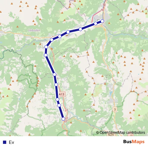 The first stop of the Ev bus route is Thusis, Bahnhof and the last stop is Chur, Bahnhofplatz. Ev is operational during täglich.