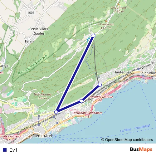 The first stop of the Ev1 bus route is Chaumont, funiculaire and the last stop is Neuchâtel, La Coudre. Ev1 is operational during täglich.