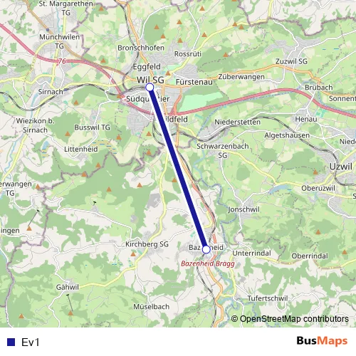 The first stop of the Ev1 bus route is Bazenheid, Bahnhof and the last stop is Wil SG, Bahnhof. Ev1 is operational during täglich.