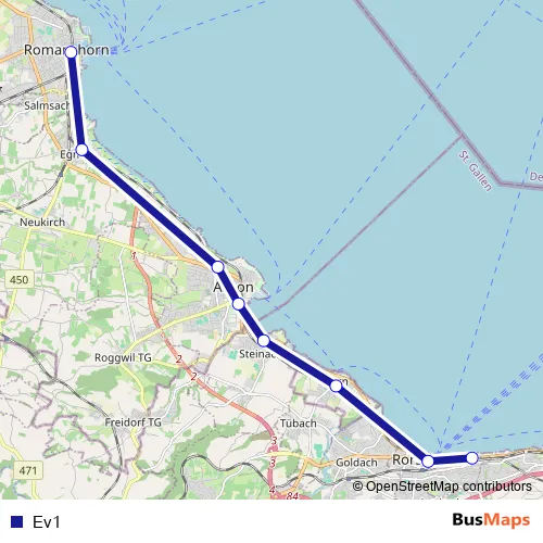 The first stop of the Ev1 bus route is Rorschach, Bahnhofplatz and the last stop is Romanshorn, Bahnhof. Ev1 is operational during täglich.