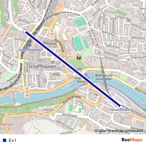 The first stop of the Ev1 bus route is Feuerthalen, Bahnhofplatz and the last stop is Schaffhausen, Bahnhof Nord. Ev1 is operational during täglich.