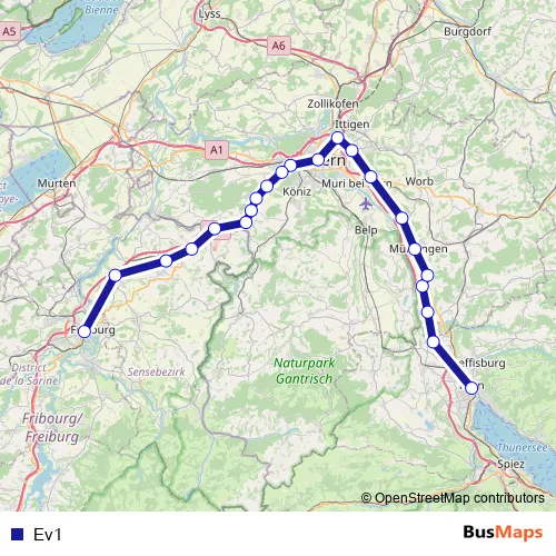 The first stop of the Ev1 bus route is Thun, Bahnhof and the last stop is Fribourg/Freiburg, Pl. Gare. Ev1 is operational during am Wochenende.