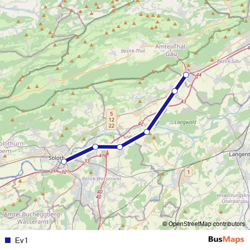 The first stop of the Ev1 bus route is Solothurn, Hauptbahnhof and the last stop is Oensingen, Bahnhof. Ev1 is operational during am Wochenende.
