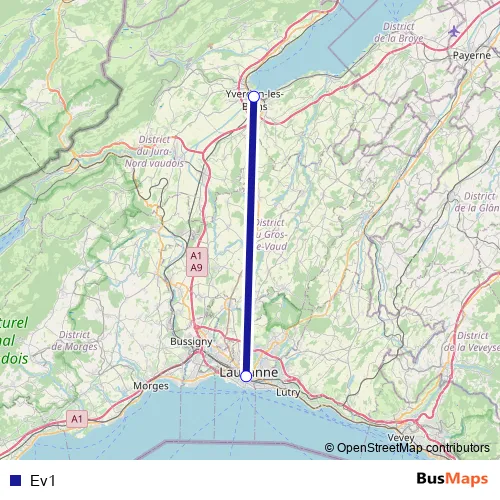The first stop of the Ev1 bus route is Lausanne, gare and the last stop is Yverdon-les-Bains, gare. Ev1 is operational during am Wochenende.
