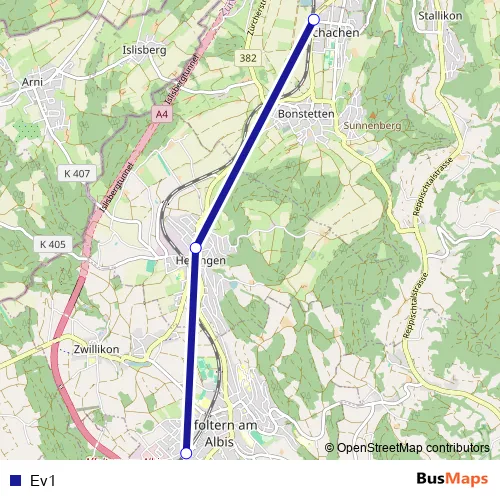 The first stop of the Ev1 bus route is Affoltern a.A., Bahnhof and the last stop is Bonstetten-Wettswil, Bahnhof. Ev1 is operational during täglich.