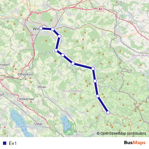 The first stop of the Ev1 bus route is Winterthur, Hauptbahnhof and the last stop is Bauma, Bahnhof. Ev1 is operational during täglich.