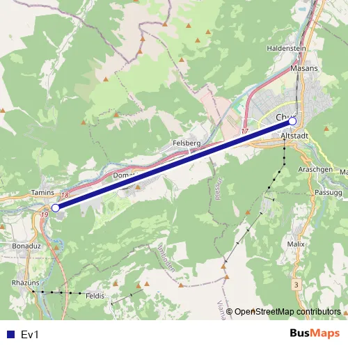 The first stop of the Ev1 bus route is Reichenau-Tamins, Bahnhof and the last stop is Chur, Bahnhofplatz. Ev1 is operational during täglich.