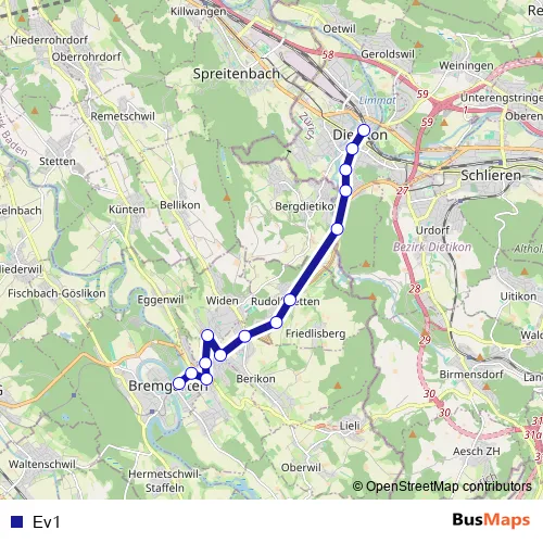 The first stop of the Ev1 bus route is Bremgarten AG, Bahnhof and the last stop is Dietikon, Bahnhof. Ev1 is operational during täglich.