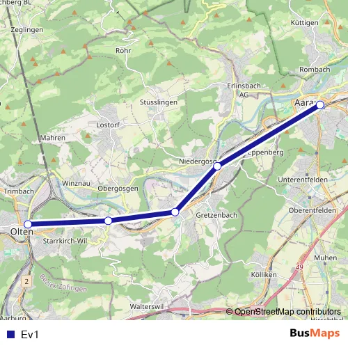 The first stop of the Ev1 bus route is Aarau, Bahnhof and the last stop is Olten, Bahnhof. Ev1 is operational during an Werktagen.