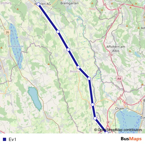 The first stop of the Ev1 bus route is Wohlen AG, Bahnhof and the last stop is Rotkreuz, Bahnhof Nord. Ev1 is operational during täglich.