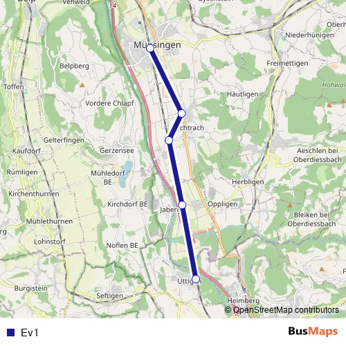 The first stop of the Ev1 bus route is Uttigen, Bahnhof and the last stop is Münsingen, Bahnhof. Ev1 is operational during täglich.