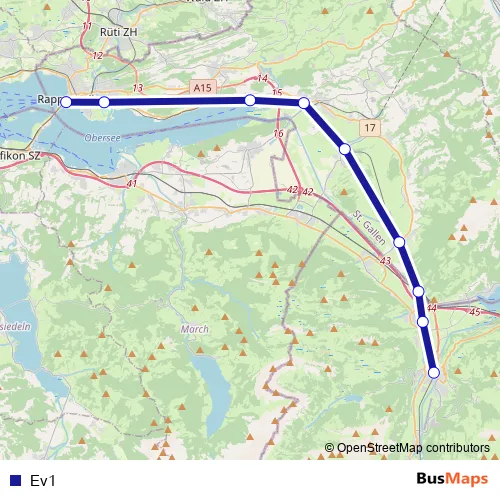 The first stop of the Ev1 bus route is Pfäffikon SZ, Bahnhof and the last stop is Lachen SZ, Bahnhof. Ev1 is operational during am Wochenende.