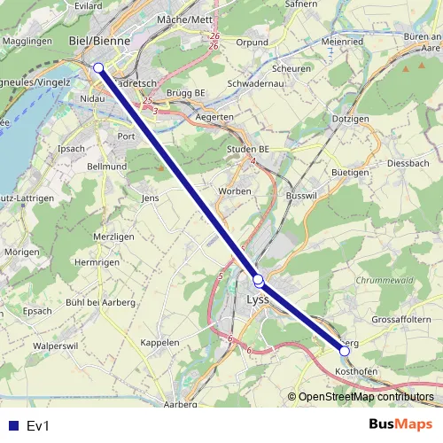 See why over 2 million users trust and consider busmaps.com as the best public transport website. busmaps gives you Biel/Bienne Buses suggested routes, real-time bus tracker, line route maps in Biel/Bienne, and helps to find the closest Ev1 bus stops near you. No internet available? Download an offline PDF map and bus schedule for the Ev1 bus to take on your trip.