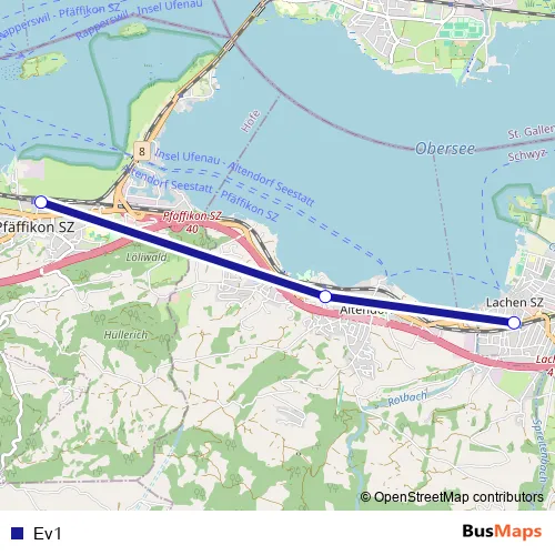 The first stop of the Ev1 bus route is Pfäffikon SZ, Bahnhof and the last stop is Lachen SZ, Bahnhof. Ev1 is operational during am Wochenende.
