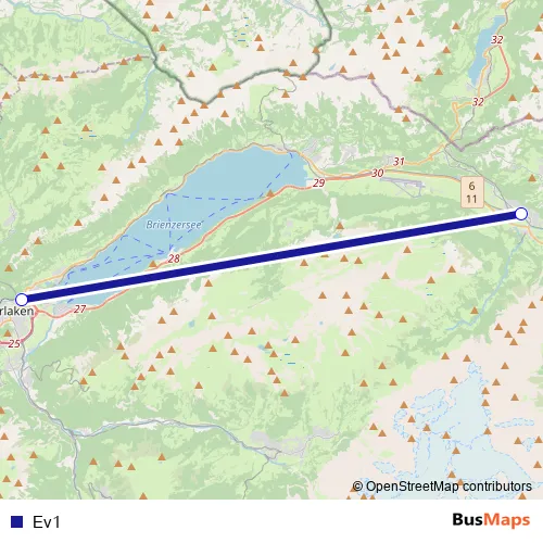 The first stop of the Ev1 bus route is Interlaken Ost, Bahnhof and the last stop is Meiringen, Bahnhof. Ev1 is operational during täglich.
