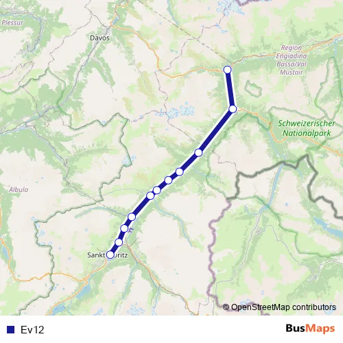 The first stop of the Ev12 bus route is Susch, staziun and the last stop is St. Moritz, Bahnhof. Ev12 is operational during täglich.