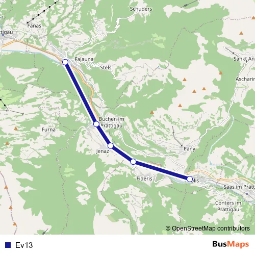The first stop of the Ev13 bus route is Küblis and the last stop is Schiers. Ev13 is operational during täglich.