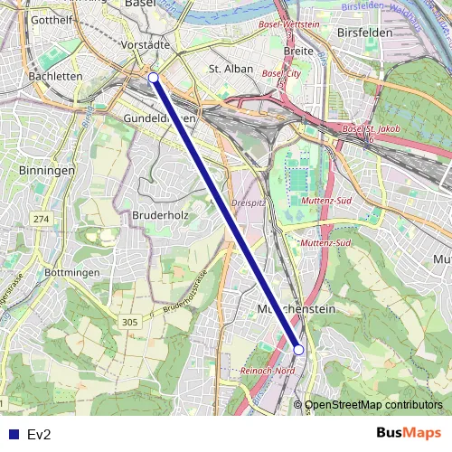 See why over 2 million users trust and consider busmaps.com as the best public transport website. busmaps gives you Basel Buses suggested routes, real-time bus tracker, line route maps in Basel, and helps to find the closest Ev2 bus stops near you. No internet available? Download an offline PDF map and bus schedule for the Ev2 bus to take on your trip.