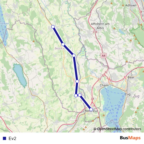 The first stop of the Ev2 bus route is Muri AG, Bahnhof and the last stop is Rotkreuz, Bahnhof Nord. Ev2 is operational during täglich.