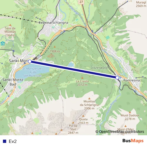 The first stop of the Ev2 bus route is Pontresina, Bahnhof and the last stop is St. Moritz, Bahnhof. Ev2 is operational during täglich.