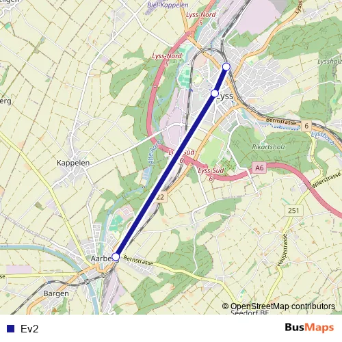 The first stop of the Ev2 bus route is Lyss, Bahnhof and the last stop is Aarberg, Post/Bahnhof. Ev2 is operational during am Wochenende.