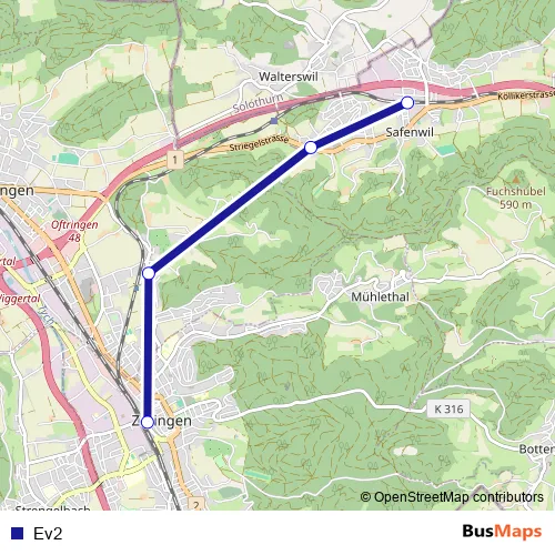 The first stop of the Ev2 bus route is Safenwil, Bahnhof and the last stop is Zofingen, Bahnhofplatz. Ev2 is operational during am Wochenende.