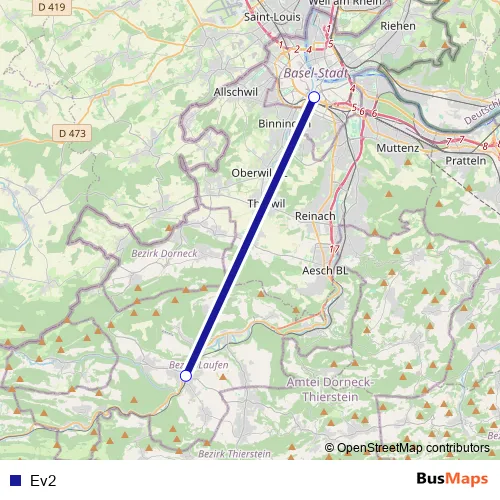 The first stop of the Ev2 bus route is Basel, Bahnhof Sbb and the last stop is Laufen, Bahnhof. Ev2 is operational during täglich.