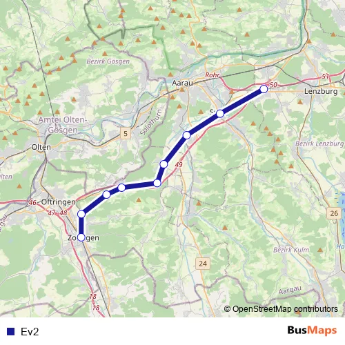 The first stop of the Ev2 bus route is Safenwil, Bahnhof and the last stop is Zofingen, Bahnhofplatz. Ev2 is operational during am Wochenende.