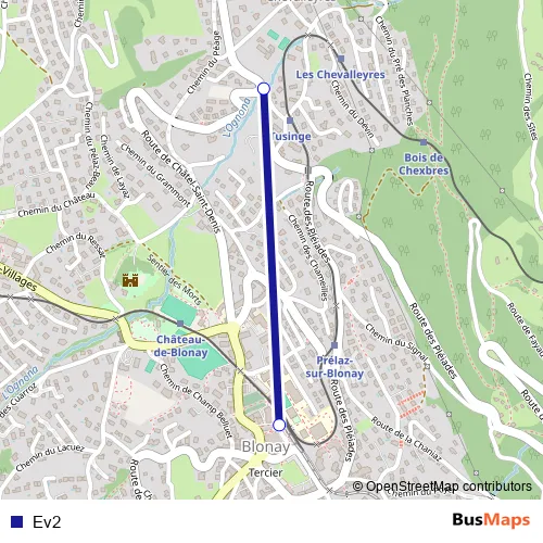The first stop of the Ev2 bus route is Blonay, Tusinge and the last stop is Blonay, gare. Ev2 is operational during am Wochenende.