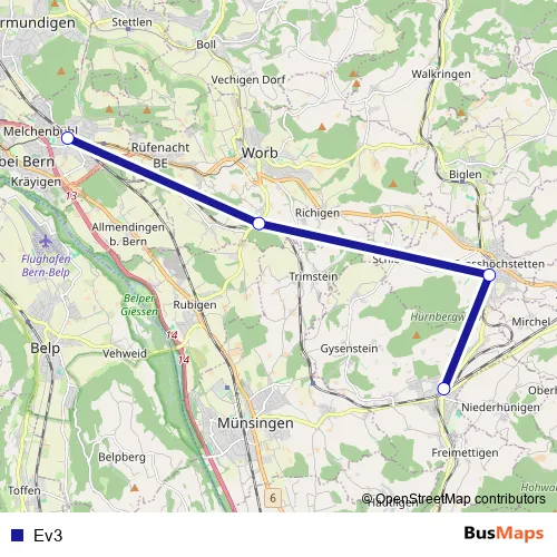 See why over 2 million users trust and consider busmaps.com as the best public transport website. busmaps gives you Bern Buses suggested routes, real-time bus tracker, line route maps in Bern, and helps to find the closest Ev3 bus stops near you. No internet available? Download an offline PDF map and bus schedule for the Ev3 bus to take on your trip.