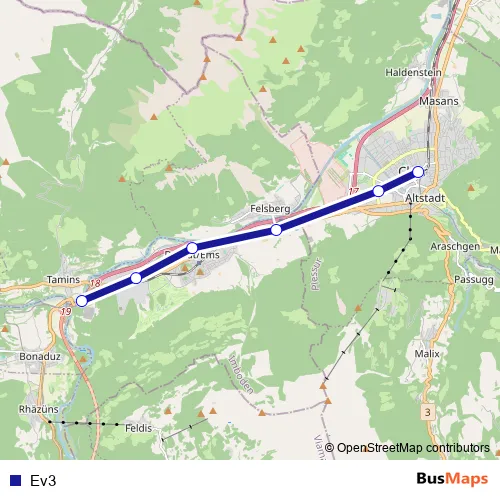 The first stop of the Ev3 bus route is Reichenau-Tamins, Bahnhof and the last stop is Chur, Gürtelstrasse. Ev3 is operational during am Wochenende.