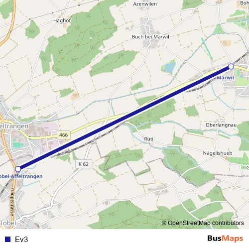 The first stop of the Ev3 bus route is Märwil, Hauptstrasse/Bhf and the last stop is Tobel-Affeltrangen, Bahnhof. Ev3 is operational during täglich.