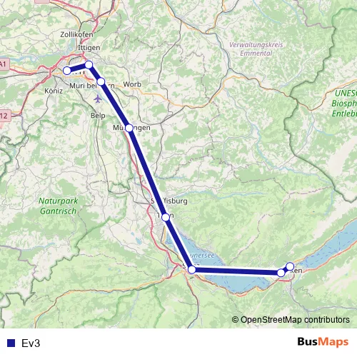 The first stop of the Ev3 bus route is Bern, Bahnhof and the last stop is Interlaken Ost, Bahnhof. Ev3 is operational during täglich.