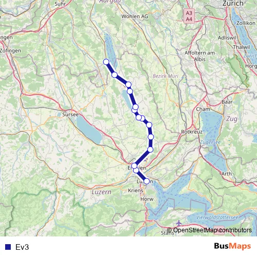 The first stop of the Ev3 bus route is Luzern, Bahnhof and the last stop is Beinwil am See, Bahnhof. Ev3 is operational during täglich.
