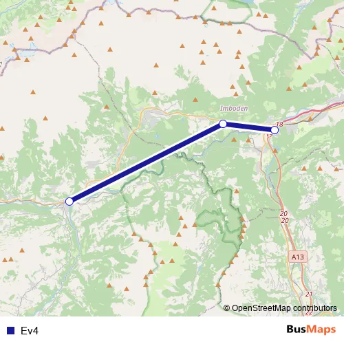 The first stop of the Ev4 bus route is Reichenau-Tamins, Bahnhof and the last stop is Ilanz, Bahnhof/Post. Ev4 is operational during am Wochenende.