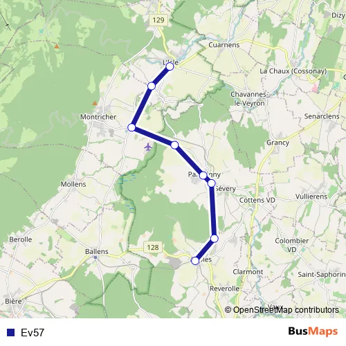 The first stop of the Ev57 bus route is L'Isle, gare and the last stop is Apples, gare. Ev57 is operational during täglich.
