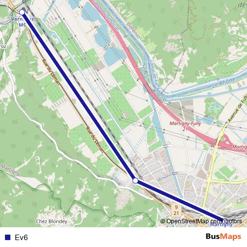 The first stop of the Ev6 bus route is Martigny, gare and the last stop is Vernayaz MC, gare. Ev6 is operational during täglich.