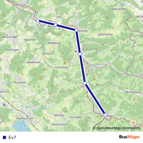 The first stop of the Ev7 bus route is Rikon im Tösstal, Bahnhof and the last stop is