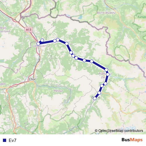 The first stop of the Ev7 bus route is Davos Platz, Bahnhof and the last stop is Malans GR, Unterdorf. Ev7 is operational during täglich.