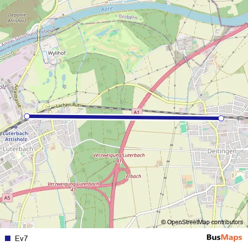 The first stop of the Ev7 bus route is Deitingen, Bahnhof and the last stop is Luterbach, Bahnhof Nordseite. Ev7 is operational during täglich.